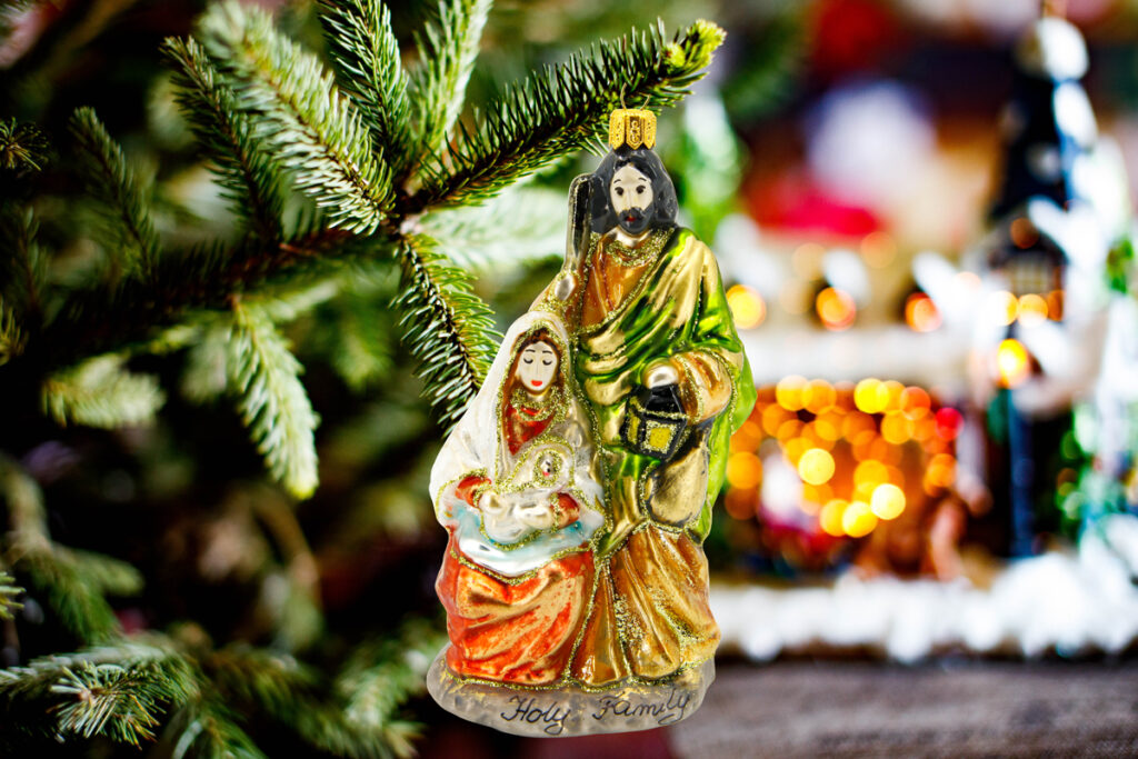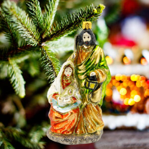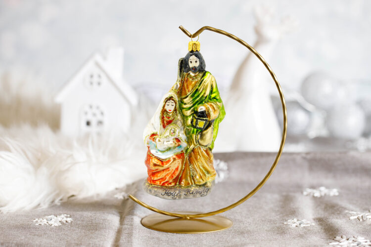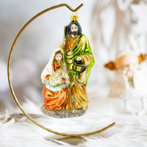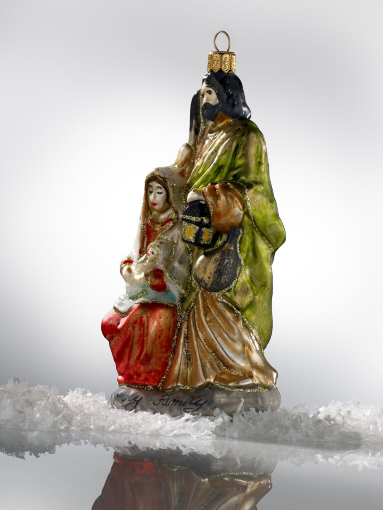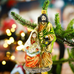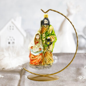 Bombka przedstawia Świętą Rodzinę: Najświętszą Maryję Pannę z Dzieciątkiem Jezus oraz czuwającego nad nimi Świętego Józefa.