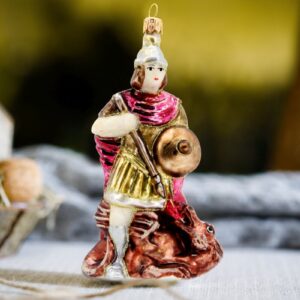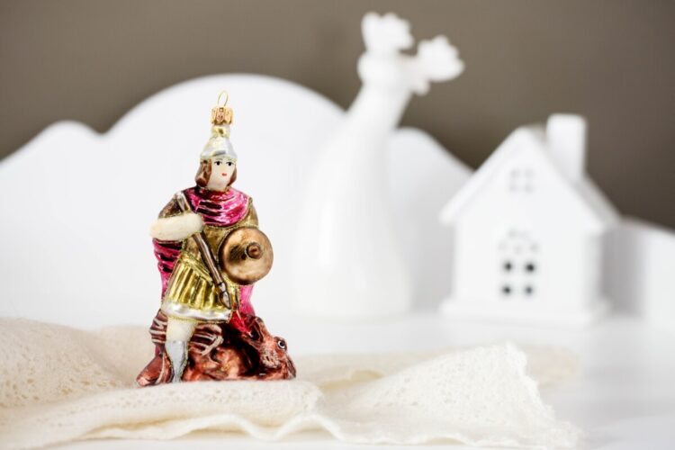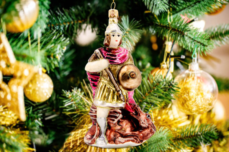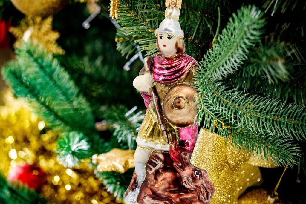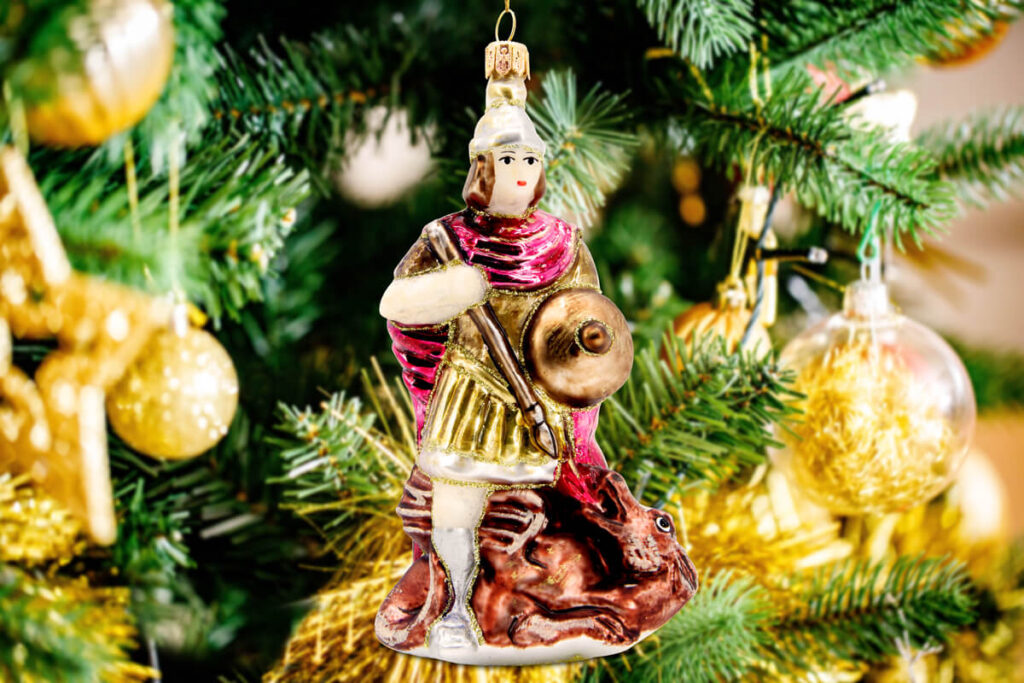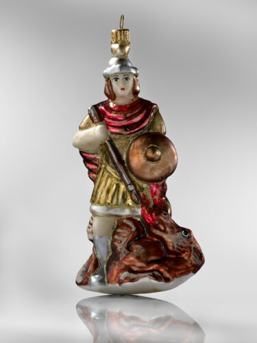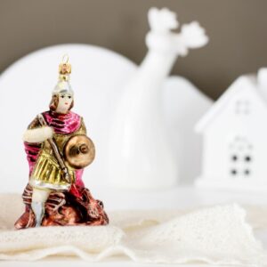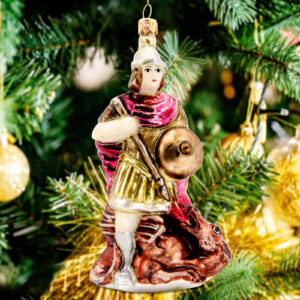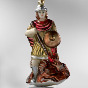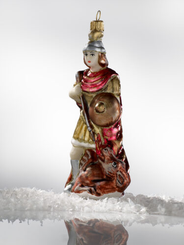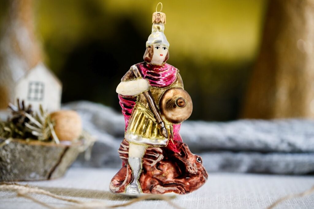 Przeznaczona jest do powieszenia na choince lub do eksponowania na stojaku. Święty Jerzy został przedstawiony w stroju legionisty rzymskiego. W dłoniach trzyma włócznię i tarczę, a u jego stóp leży pokonany smok.